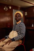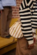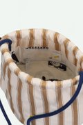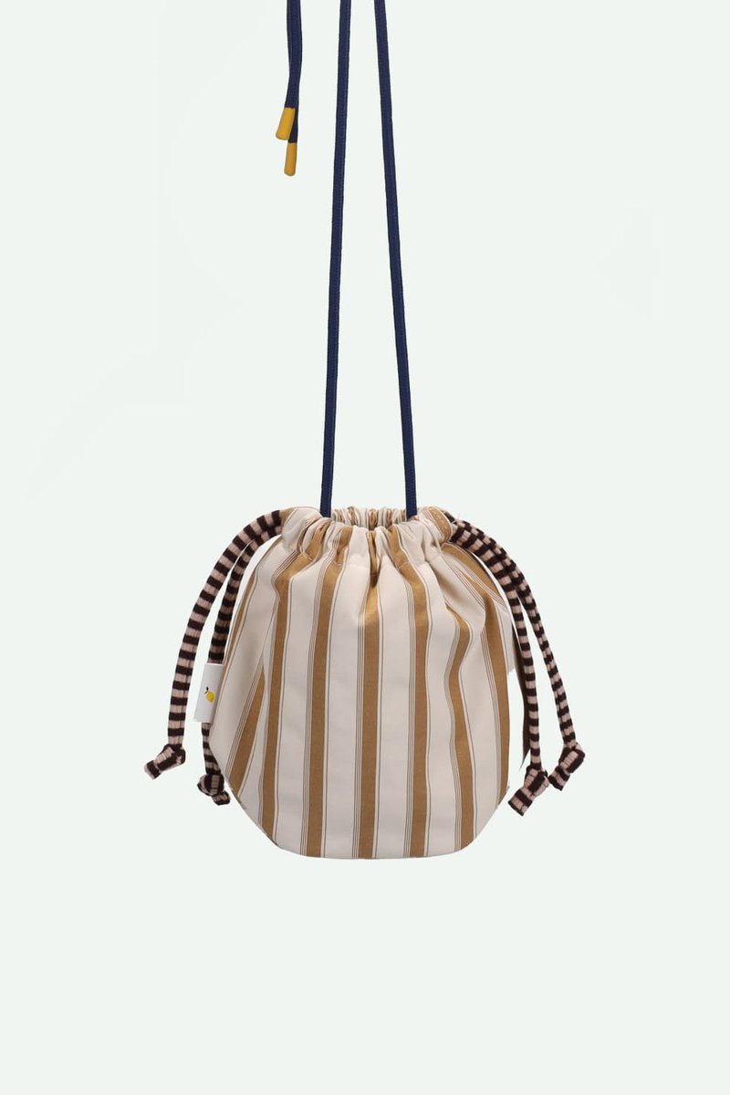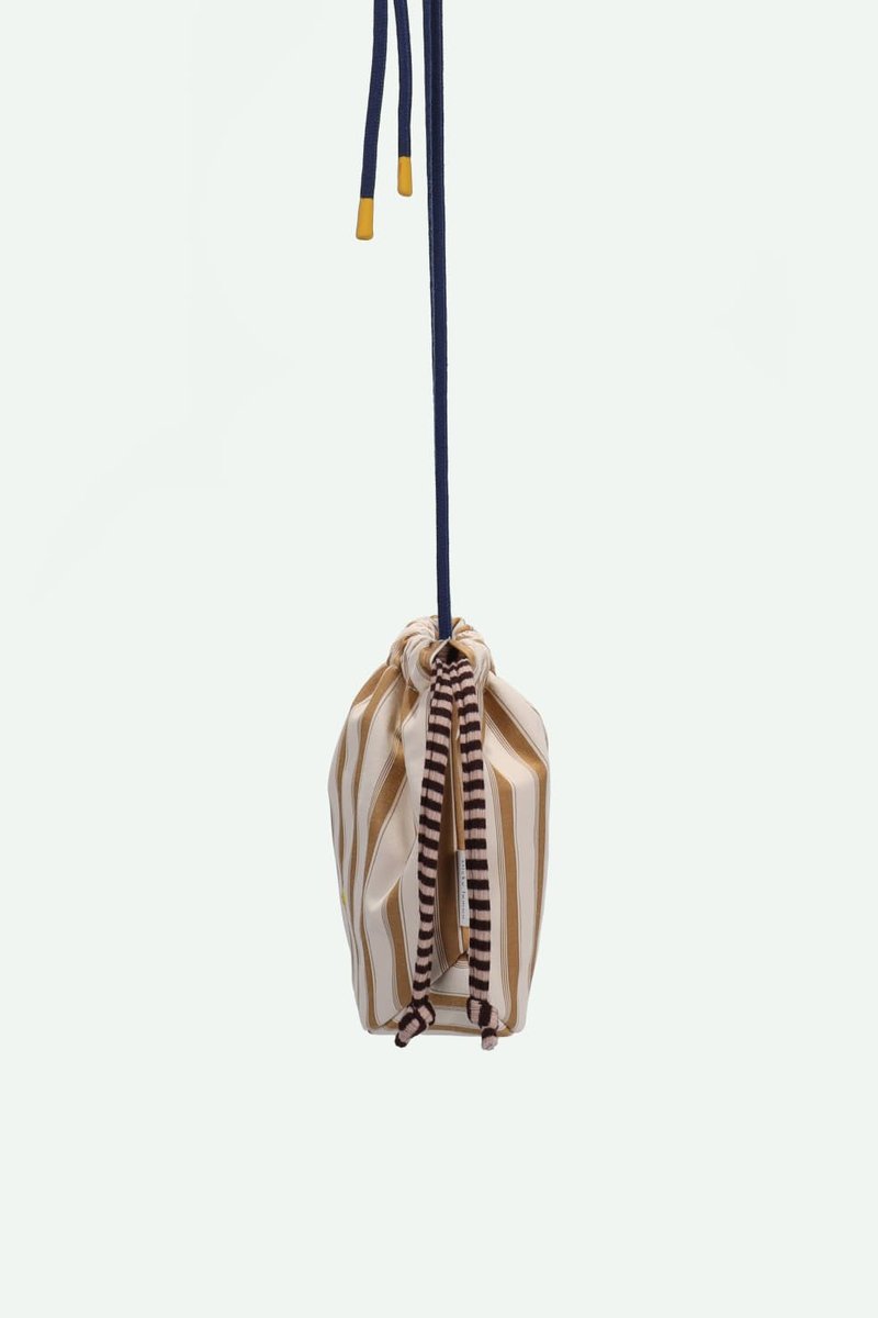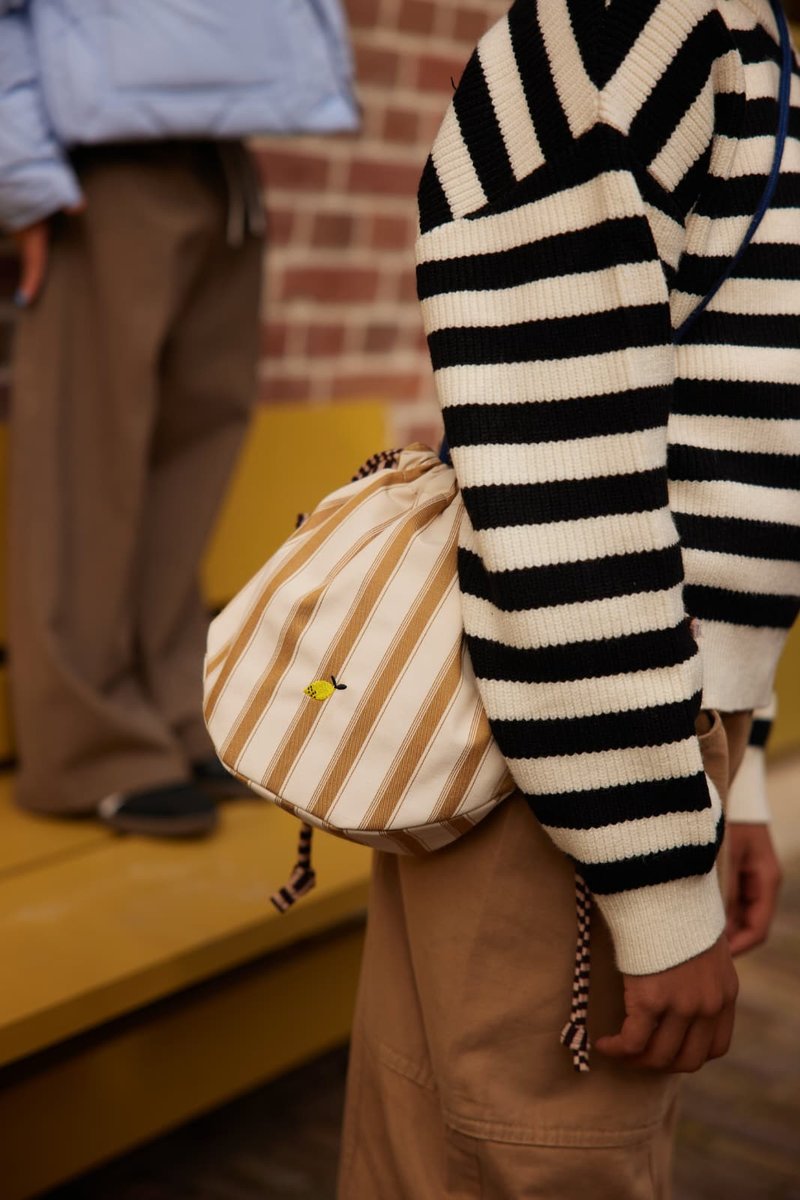 This pouch bag closes with a drawstring and its pyjama stripes can hold all your deep sea findings. On the inside there's a small extra pocket that closes with a zipper. The strap can be tied at your desired length so anyone can wear it!