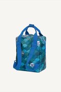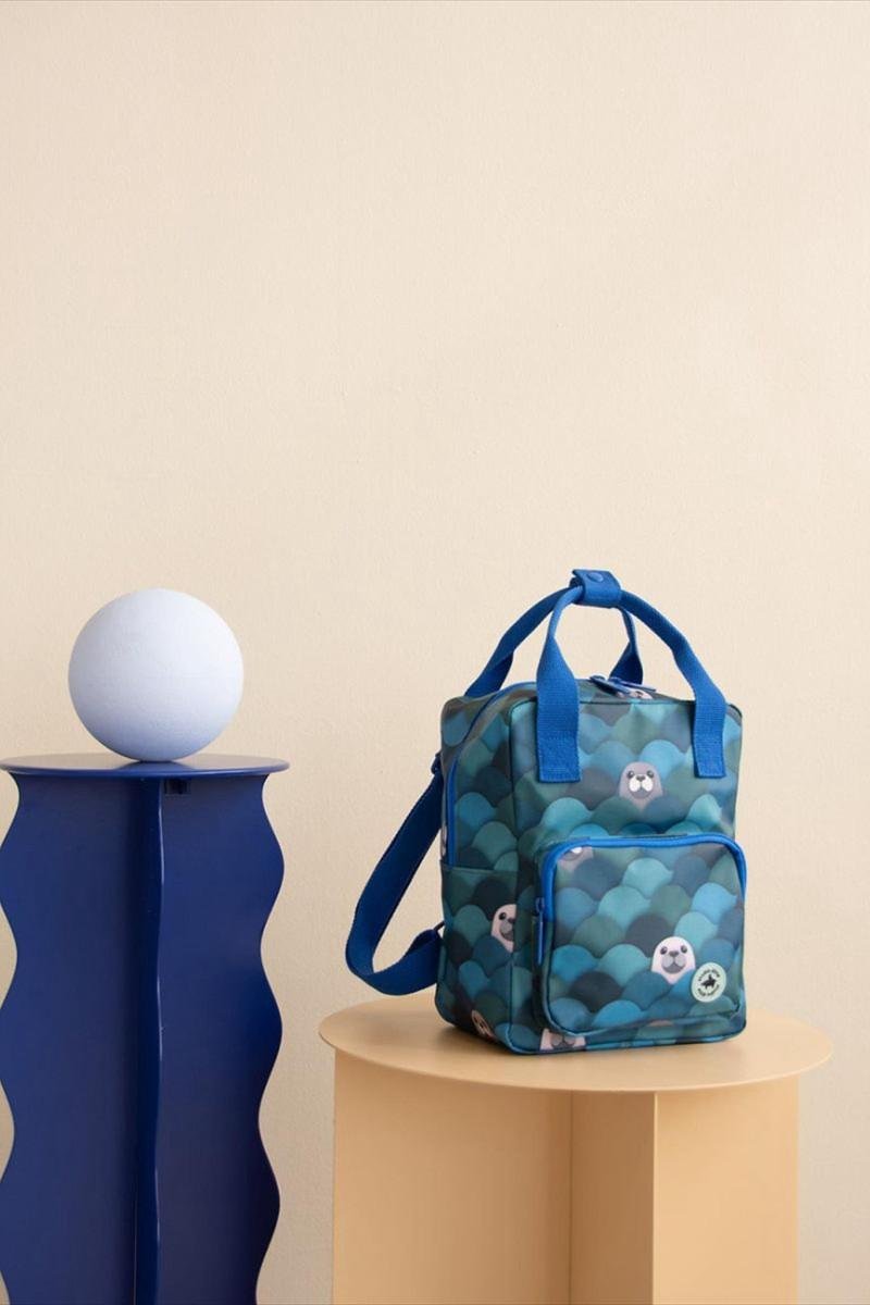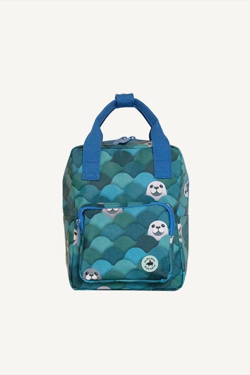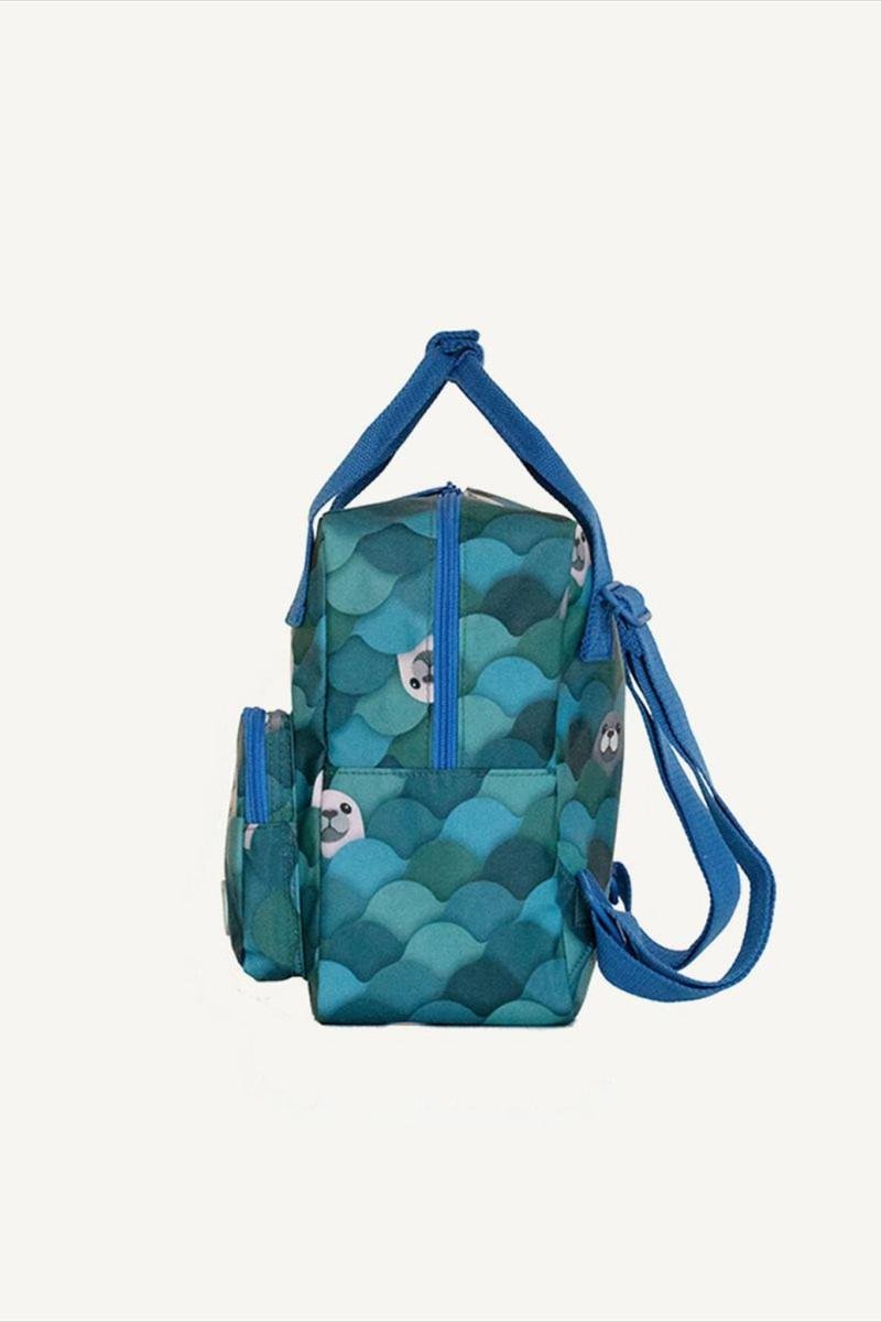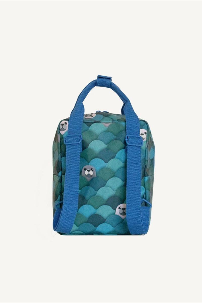 This backpack is made from recycled PET bottles! It has a seal patternon its body. The lining is waterproof, the zippers are from YKK and the shoulder handles are adjustable. On the inside you`ll find an elastic bottle holder and a pocket all over the back that closes with velcro.
