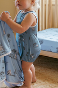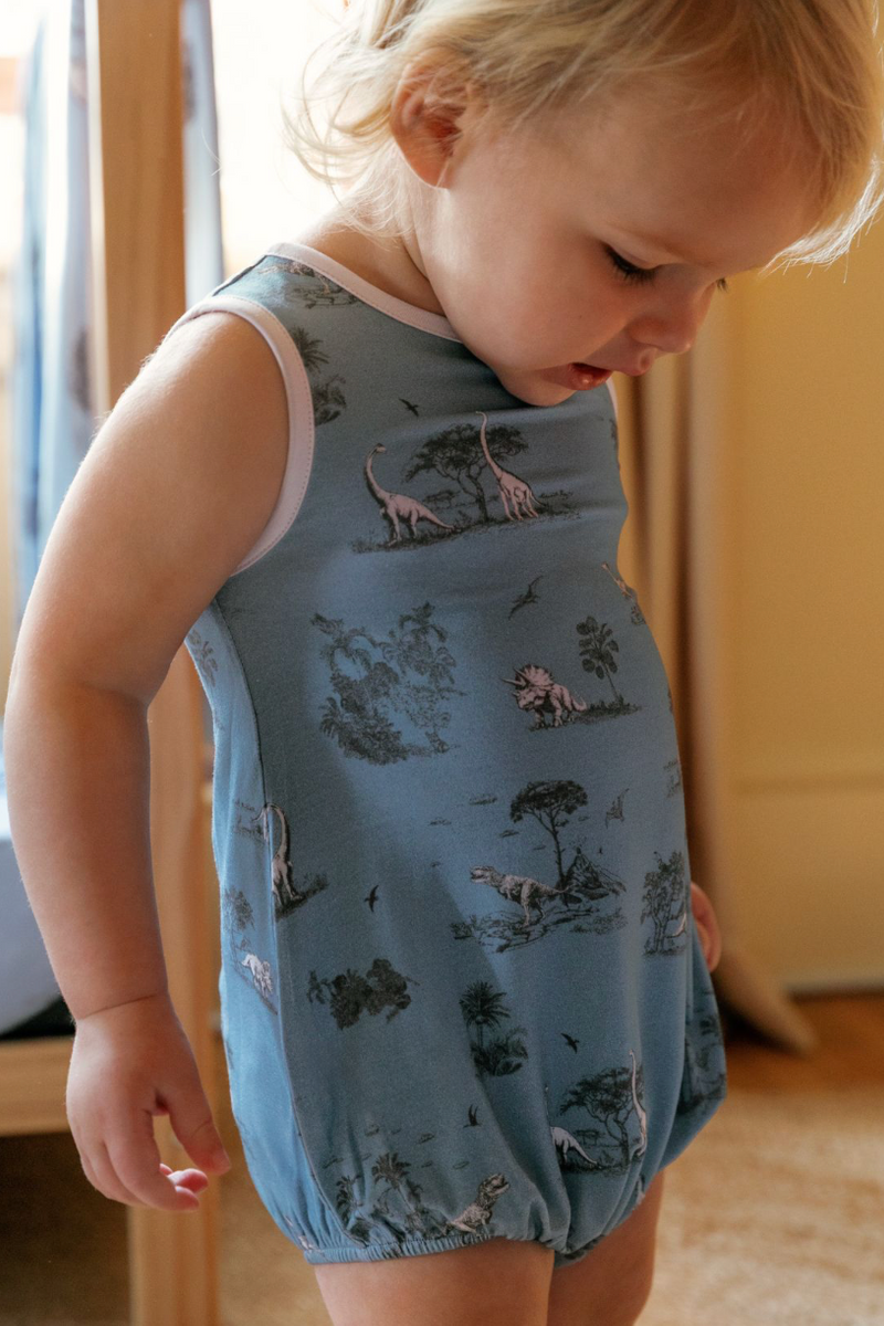 Like a stroll through a calm prehistoric night, our Cloud Bubble Romper – Dinosaur (Blue) wraps your little one in soft, breathable comfort with a playful, storybook charm. Featuring our whimsical dinosaur motif against a rich dark-blue background, accented with crisp white piping, this romper sparks curiosity while remaining soothing and timeless.