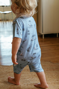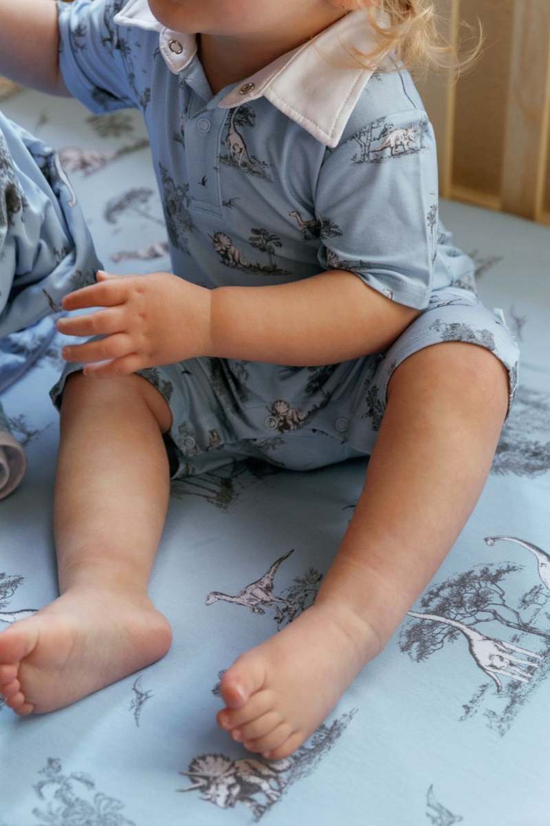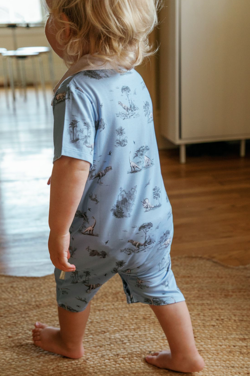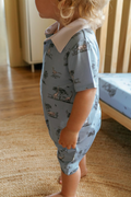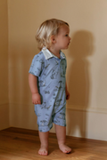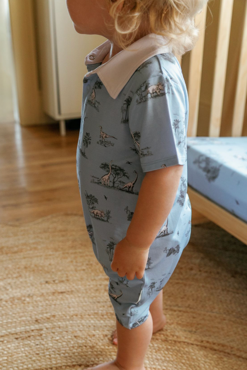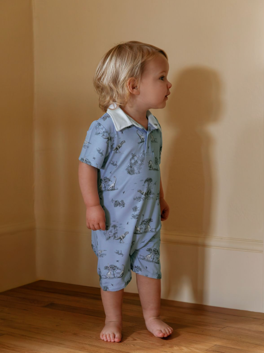 Effortlessly charming, this collared romper combines a classic silhouette with playful storytelling. Crafted from our signature soft bamboo fabric, it features a pointed collar, button-down front, and a subtle nod to adventure with our whimsical dinosaur motif set against a rich dark-blue background with crisp white piping.