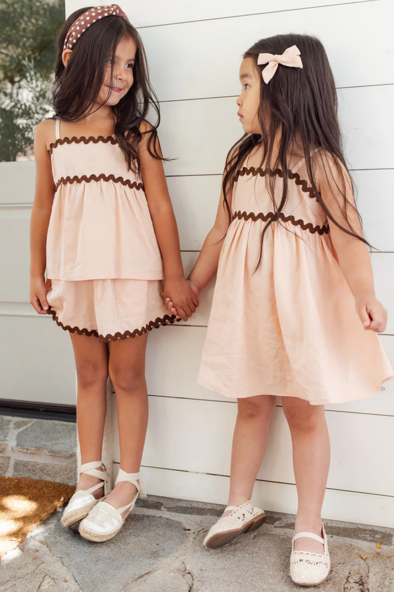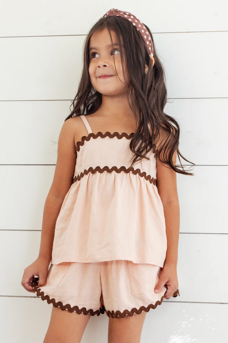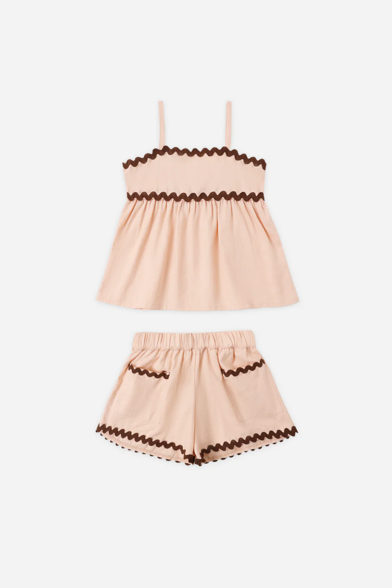 Our Ric Rac Set is a light and flowy set that features ric rac trim along neckline and waist seam, a gathered babydoll silhouette and matching wide-leg shorts with an elastic waistband. This set is an easy go-to for everyday wear.