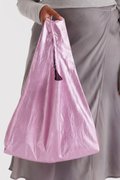 Starting with our Spring 2022 collection, all of our ripstop nylon styles are now made with 100% recycled nylon filament yarn (up from 40% recycled before). This 100% recycled nylon yarn is produced from pre-consumer waste, which saves scrap material from being landfilled — meaning every Standard Baggu is now made entirely from nylon that would otherwise go to a landfill. This also conserves petroleum resources, and reduces greenhouse gas emissions.